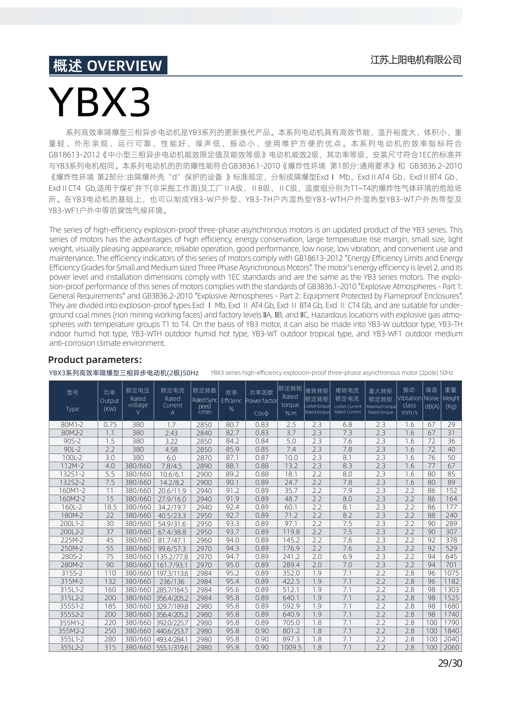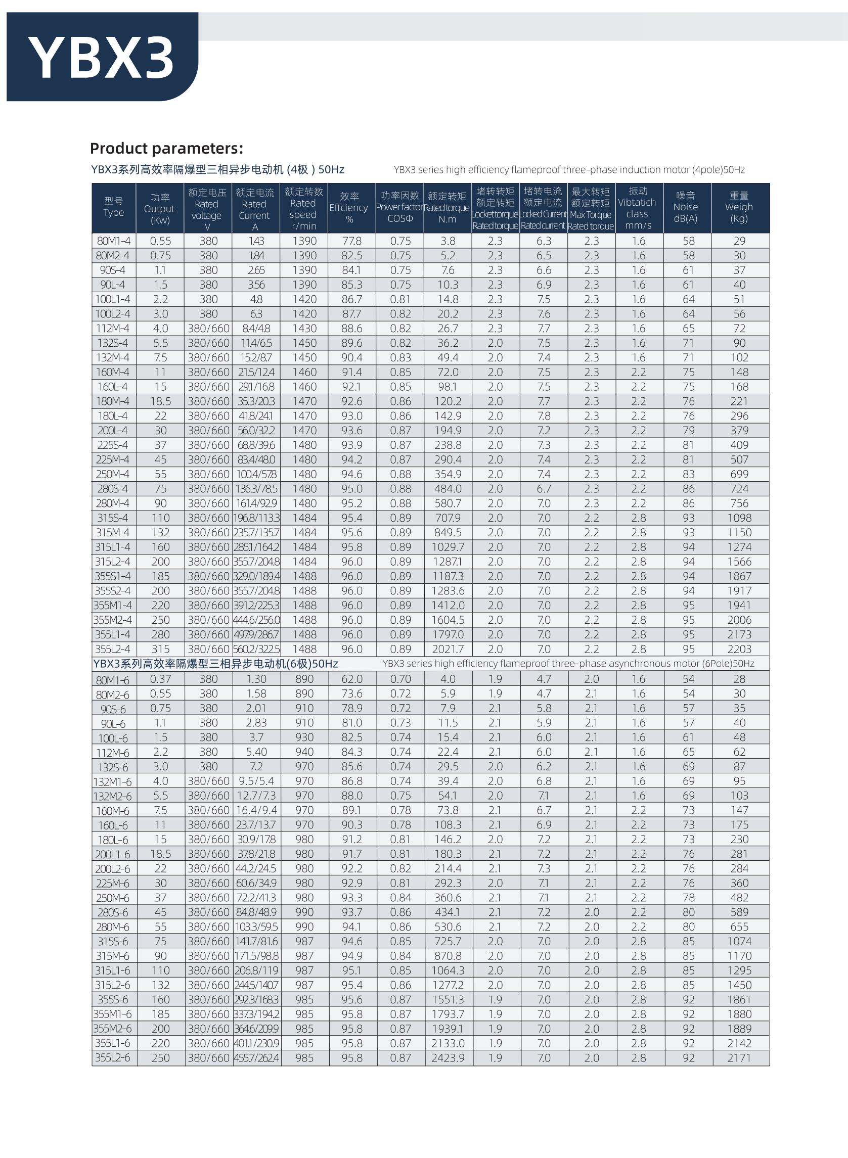 YBX3系列高效率隔爆型三相異步電動機是YB3系列的更新?lián)Q代產(chǎn)品。本系列電動機具有高效節(jié)能、溫升裕度大、體積小、重量輕、外形美觀、運行可靠、性能好、噪聲低、振動小、使用維護方便的優(yōu)點。本系列電動機的效率指標符合GB18613-2012《中小型三相異步電動機能效限定值及能效等級》電動機能效2級,其功率等級、安裝尺寸符合IEC的標準并與YB3系列電機相同。 本系列電動機的防爆性能符合GB3836.1-2010《爆炸性環(huán)境 第1部分:通用要求》和 GB3836.2-2010《爆炸性環(huán)境 第2部分:由隔爆外殼“d”保護的設(shè)備 》標準的規(guī)定,分別制成隔爆型Exd I Mb、ExdⅡBT4 Gb、ExdⅡBT4 Gb、ExdICT4 Gb,適用于煤礦井下(非采掘工作面)及工廠ⅡA、ⅡB、ⅡC級,溫度組分別為T1~T4的爆炸性氣體環(huán)境的危險場所。 在YB3電動機的基礎(chǔ)上,也可以制成YB3-W戶外型、YB3-TH戶內(nèi)濕熱型、YB3-WTH戶外濕熱型、YB3-WT戶外熱帶型及YB3-WF1戶外中等防腐蝕氣候環(huán)境。